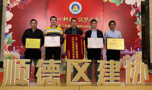 公司生產(chǎn)運(yùn)營部總經(jīng)理李敏總(左二)、安全監(jiān)督部總經(jīng)理呂偉軍總(左四)代表廣東騰越及廣東龍越獲頒“順德區(qū)建筑業(yè)協(xié)會先進(jìn)企業(yè)”獎