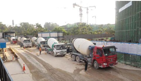 混凝土攪拌車排隊(duì)等候澆筑