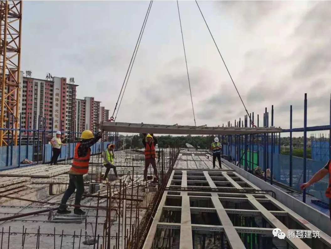 由于文昌高隆灣項(xiàng)目是海南公司首個(gè)裝配式應(yīng)用工程,在項(xiàng)目建造前期,面對(duì)技術(shù)方面的空白,項(xiàng)目團(tuán)隊(duì)查閱、借鑒其他眾多裝配式優(yōu)秀工程案例,多次召開碰頭討論會(huì),結(jié)合項(xiàng)目現(xiàn)場(chǎng)所需,化為己用,努力克服材料資源短缺、勞動(dòng)力不足等困難,于2021年3月4日成功吊裝第一塊預(yù)制疊合板,代表著項(xiàng)目的階段性勝利。