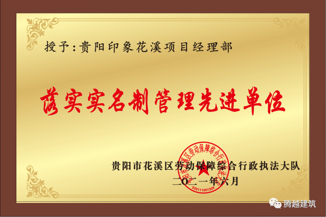 貴陽市花溪區(qū)勞務保障綜合行政執(zhí)法大隊為騰越建筑貴州公司印象花溪項目頒發(fā)“落實實名制管理先進單位”榮譽。