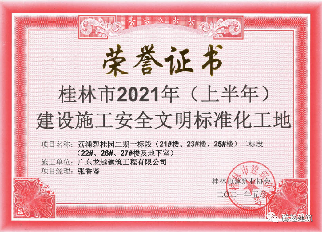 騰越建筑廣西公司荔浦二期項目承建荔浦碧桂園二期一標段(21#樓、23#樓、25#樓)、二標段(22#、26#、27#樓及地下室)工程突出重圍,斬獲桂林市2021年(上半年)桂林市建設施工安全文明標準化工地榮譽稱號。
