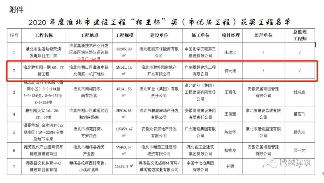 淮北市住房和城鄉(xiāng)建設局發(fā)布《關于2020年淮北市建設工程“相王杯”獎(市優(yōu)質(zhì)工程)獲獎工程名單的公示》,騰越建筑安徽公司淮北一期一標段項目6#、7#樓工程榮登榜單。