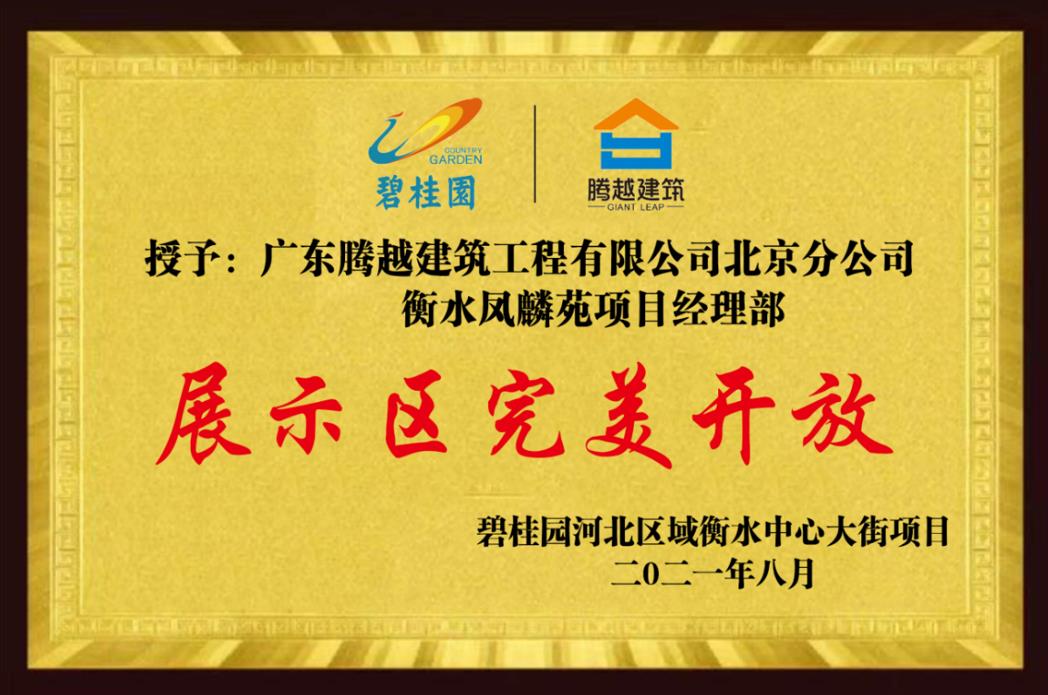 項目坐落于衡水市桃城區(qū)裕華西路南側(cè),總建筑面積11萬㎡,展示區(qū)建筑面積1823㎡。項目不僅取得了聯(lián)合驗收94.2分的優(yōu)異的成績,更獲得了碧桂園河北區(qū)域授予的“完美開放”獎牌以及最佳配合單位錦旗!