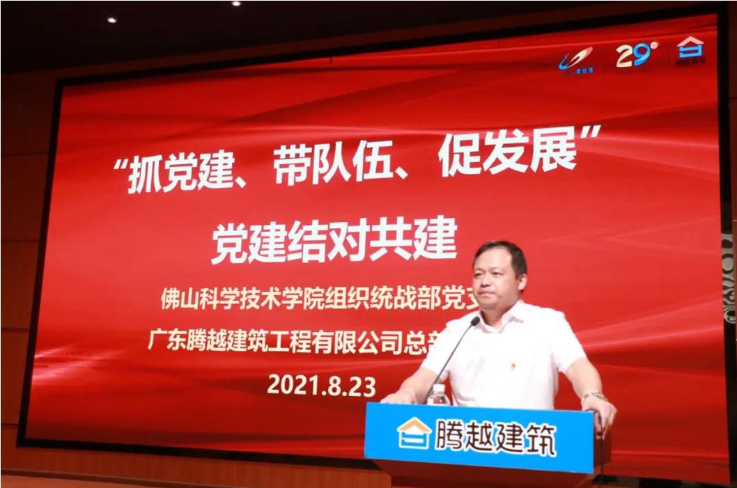 2021年8月23日,騰越建筑黨委與佛山科學(xué)技術(shù)學(xué)院組織統(tǒng)戰(zhàn)部黨支部隆重召開“抓黨建、帶隊(duì)伍、促發(fā)展“黨建結(jié)對共建活動(dòng)。佛山科學(xué)技術(shù)學(xué)院黨委書記、教授曾崢等一行領(lǐng)導(dǎo)及組織統(tǒng)戰(zhàn)部黨支部相關(guān)黨員干部,碧桂園黨委委員、騰越建筑黨委書記、總經(jīng)理馬小軍,黨委副書記、執(zhí)行總經(jīng)理鄧培初等黨委委員出席活動(dòng)。