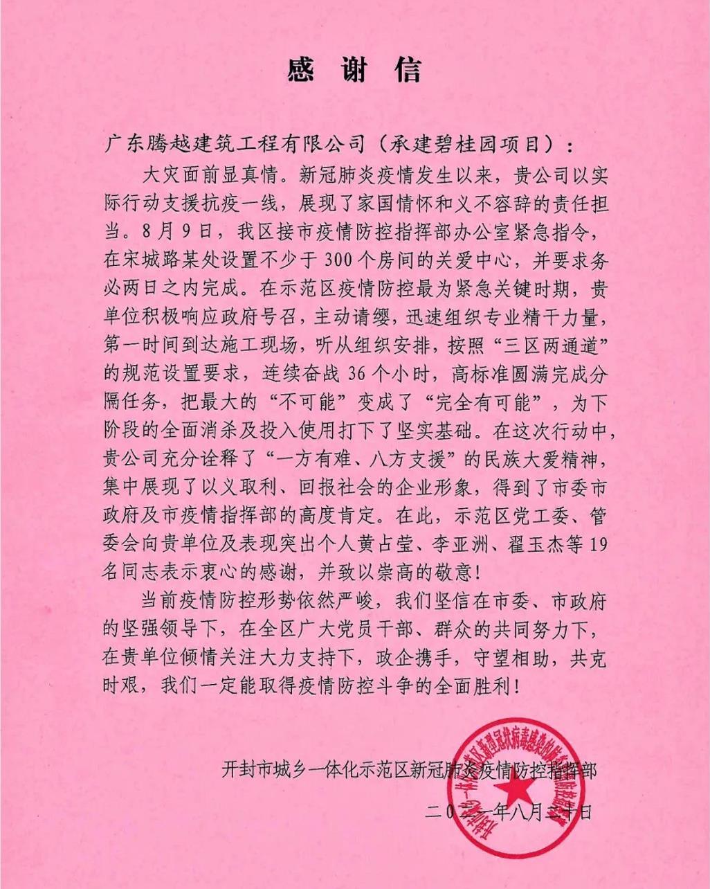 河南公司開封天璽項目收到開封城鄉(xiāng)一體化示范區(qū)住建局新冠肺炎疫情防控指揮部感謝信