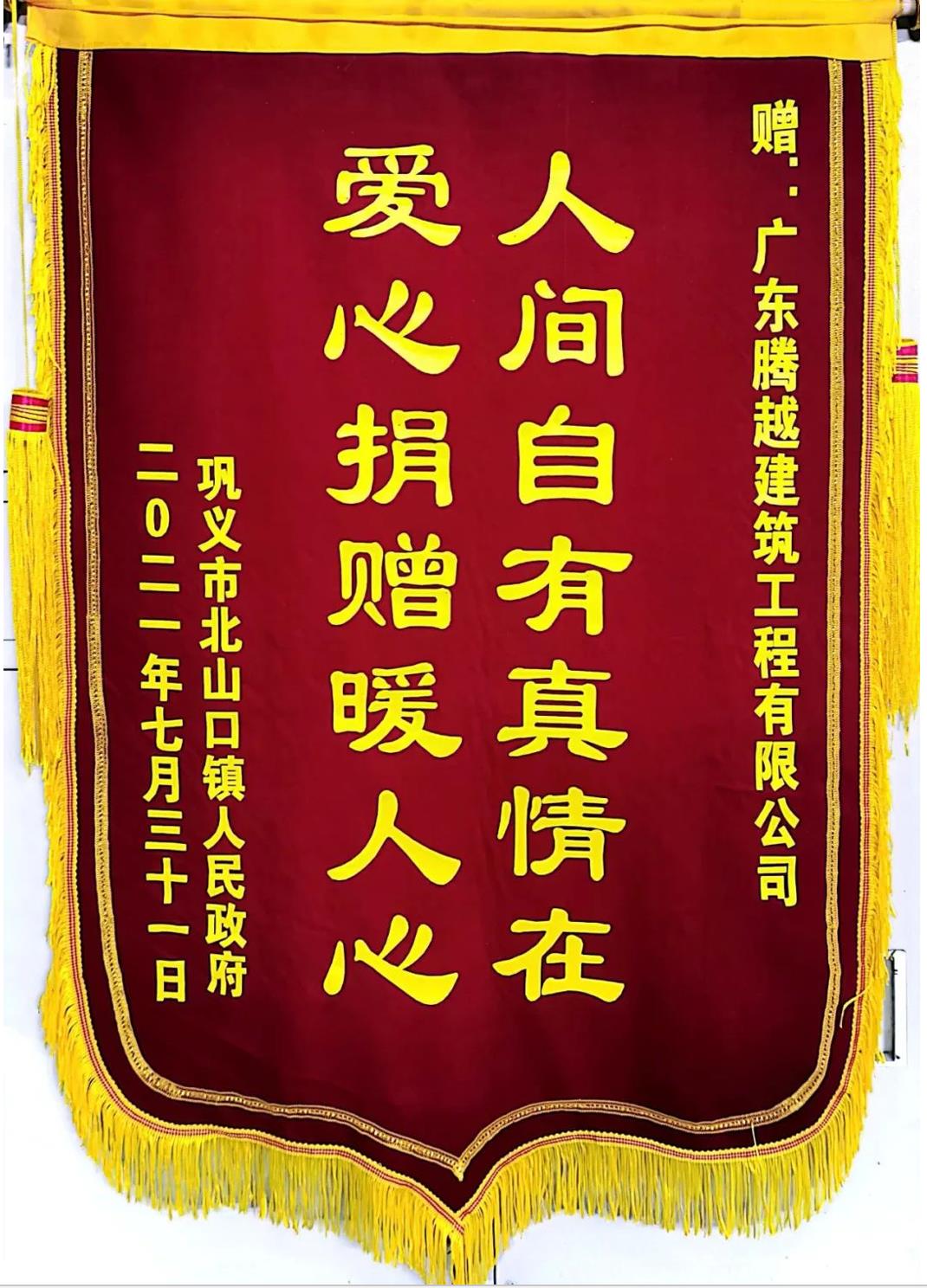 而這份愛(ài)也獲得了河南省當(dāng)?shù)卣目隙ㄅc感謝,河南省鞏義市北山口鎮(zhèn)人民政府為騰越建筑河南公司金科天宸項(xiàng)目頒發(fā)表彰錦旗,感謝騰越建筑對(duì)鞏義市受災(zāi)村鎮(zhèn)的無(wú)私支持。