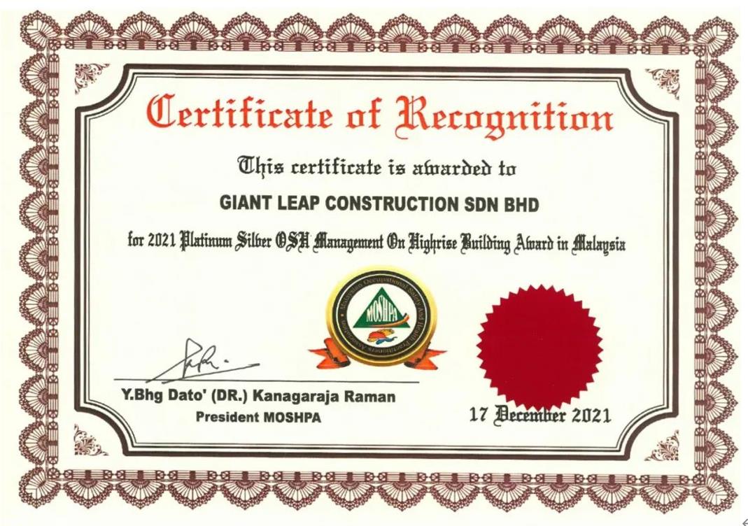 樂森世紀項目榮膺馬來西亞國家職業(yè)安全與健康協(xié)會(MOSHPA)頒發(fā)“高層建筑建設(shè)類建筑健康安全管理鉑金銀獎”,成為馬來西亞柔佛州首個摘得該獎項的項目。