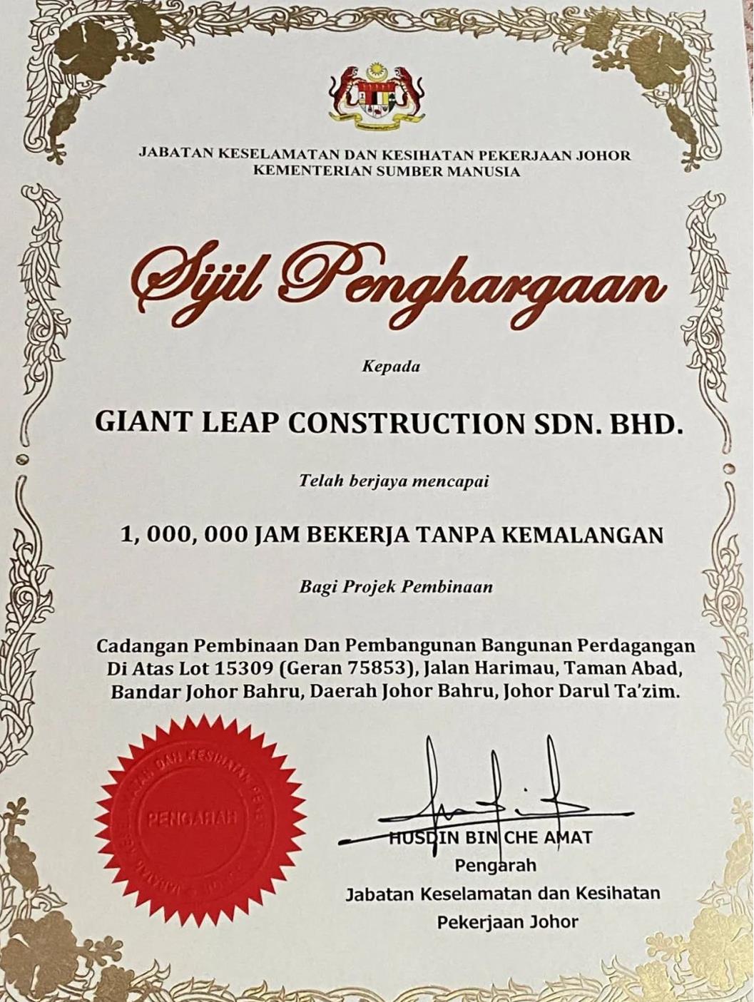 樂森世紀項目獲柔佛州職業(yè)安全與衛(wèi)生局(JKKP)頒發(fā)“100萬工時零安全事故”獎狀,譜寫800多天以來的零安全事故紀錄!