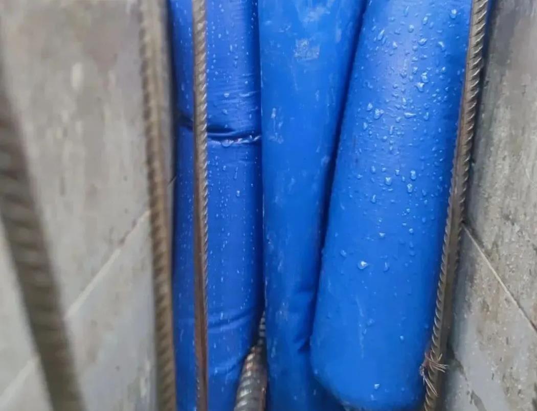 其中高低標(biāo)號(hào)混凝土攔截氣囊施工技術(shù)是一種可以充氣放氣的圓柱型柔性氣模,充氣后起到分隔高低標(biāo)號(hào)混凝土的作用,代替此部位原來使用的鋼絲網(wǎng),減少應(yīng)力,避免接茬部位后期產(chǎn)生裂縫(施工縫),周轉(zhuǎn)使用次數(shù)高,可周轉(zhuǎn)40~50 次,適用于結(jié)構(gòu)梁與剪力墻、柱處不同等級(jí)砼之間的攔截措施。