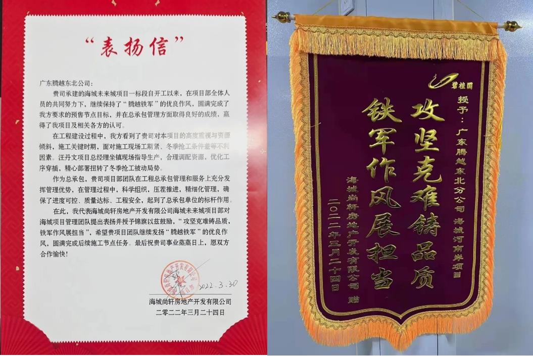 寒冷的氣溫,對(duì)混凝土及管理人員都是極大的考驗(yàn),旁站的項(xiàng)目鐵軍臉蛋通紅,嘴唇干裂,3月26日,在全體同心協(xié)力的緊密配合下,完美完成預(yù)售節(jié)點(diǎn),提前3天完成任務(wù),甲方為海城碧桂園河南岸項(xiàng)目團(tuán)隊(duì)還發(fā)來(lái)“表?yè)P(yáng)信”并授予項(xiàng)目“攻堅(jiān)克難鑄品質(zhì),鐵軍作風(fēng)展擔(dān)當(dāng)”錦旗。
