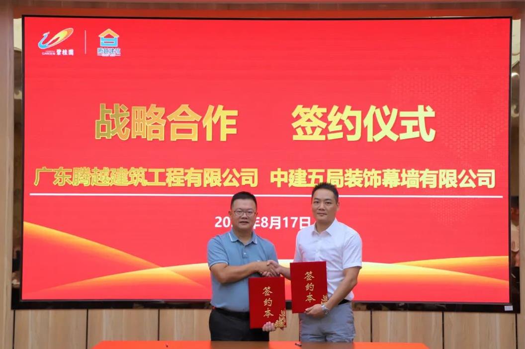 2022年8月17日,中建五局裝飾幕墻有限公司與騰越建筑隆重舉行座談交流會(huì)暨合作簽約儀式。中建五局裝飾幕墻有限公司董事長李滔、副總經(jīng)理彭洪波、華南總經(jīng)理胡進(jìn)、副總經(jīng)理朱文明等領(lǐng)導(dǎo),騰越建筑總經(jīng)理馬小軍、執(zhí)行總經(jīng)理鄧培初、副總經(jīng)理兼總經(jīng)濟(jì)師田志敏、總經(jīng)理助理卿上偉、資深營銷總監(jiān)兼部門總經(jīng)理曹小華、裝飾公司總經(jīng)理馬芯及市場拓展相關(guān)人員出席儀式。