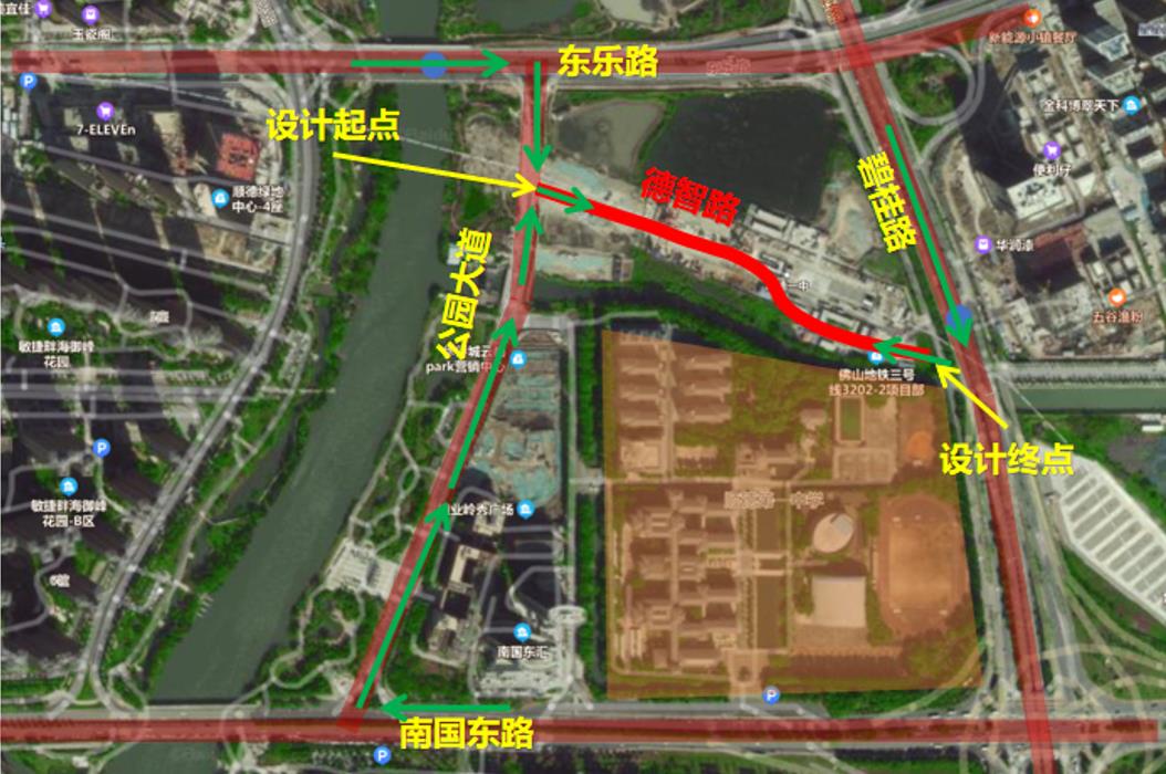 佛山地鐵三號(hào)線站點(diǎn)接駁市政配套德智路工程本項(xiàng)目位于佛山市順德區(qū)大良街道地鐵三號(hào)線創(chuàng)意園站,順德新城創(chuàng)智城片區(qū)。路線呈東西走向,西起于公園大道,東終于碧桂路輔道,道路全長(zhǎng)0.55km,道路等級(jí)為城市次干路,道路紅線寬度 30m,雙向4車(chē)道,設(shè)計(jì)車(chē)速 30km/h,路面面層類(lèi)型為瀝青混凝土。