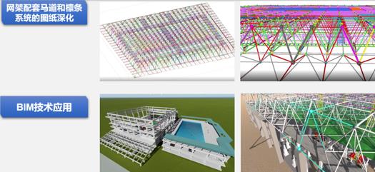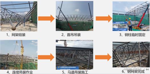 在鋼結(jié)構(gòu)網(wǎng)架屋面施工時同樣如此,由項目技術(shù)攻堅小組成員編制鋼結(jié)構(gòu)網(wǎng)架屋面專項施工方案并組織專家論證,按照論證通過后的方案,網(wǎng)架首吊起步架約600㎡,重量約30噸,通過技術(shù)深化及視頻吊裝模擬、起步架拼裝驗收、起步架試吊、起步架完成吊裝等標(biāo)準(zhǔn)件拼裝等工序,逐步完成鋼結(jié)構(gòu)網(wǎng)架屋面工程,從而保障了項目建設(shè)順利推進。