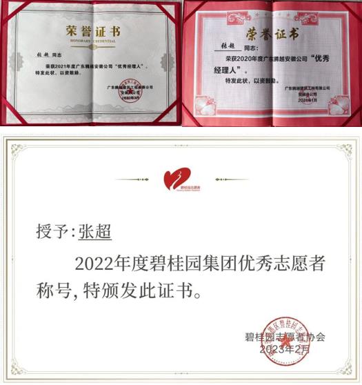張超,中國(guó)共產(chǎn)黨黨員,騰越建筑安徽分公司綜合管理部人力行政經(jīng)理,加入公司后以飽滿(mǎn)的工作熱情與扎實(shí)的工作作風(fēng)為人稱(chēng)道,2020-2021年度連續(xù)獲得“優(yōu)秀經(jīng)理人”稱(chēng)號(hào)、2022年獲碧桂園集團(tuán)“優(yōu)秀志愿者”稱(chēng)號(hào)、“集團(tuán)一星講師”。