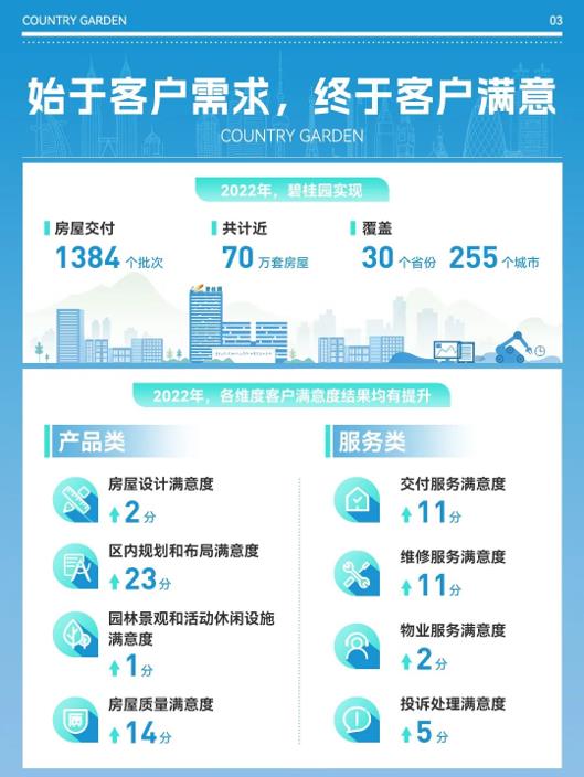 2020年以來(lái),碧桂園連續(xù)多年實(shí)施“強(qiáng)基行動(dòng)”,開(kāi)展工程師文化季活動(dòng),全面提升基礎(chǔ)產(chǎn)品力。根據(jù)最新發(fā)布的碧桂園ESG報(bào)告,2022 年,碧桂園在產(chǎn)品質(zhì)量方面獲得廣廈獎(jiǎng)項(xiàng)目 7個(gè),中國(guó)建筑工程裝飾獎(jiǎng)項(xiàng)目1個(gè),省級(jí)質(zhì)量獎(jiǎng)項(xiàng) 142 個(gè),市級(jí)質(zhì)量獎(jiǎng)項(xiàng)97個(gè)。產(chǎn)品、服務(wù)類的客戶滿意度結(jié)果均有提升。