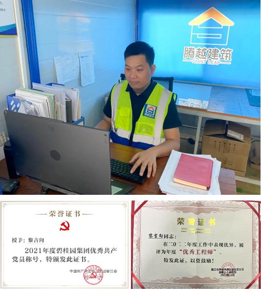 黎吉向,男,漢族,中國(guó)共產(chǎn)黨員,曾任騰越建筑海南分公司海南文昌高隆灣項(xiàng)目聯(lián)合黨支部書(shū)記,現(xiàn)任海南分公司海南之心聯(lián)合黨支部宣傳委員、海南之心A15-02地塊項(xiàng)目勞務(wù)經(jīng)理,是大家在工作上有口皆碑的“百事通”“文武”全能型人才,獲2021“碧桂園集團(tuán)優(yōu)秀共產(chǎn)黨員”2022碧桂園海南區(qū)域項(xiàng)目“優(yōu)秀工程師”稱(chēng)號(hào)。