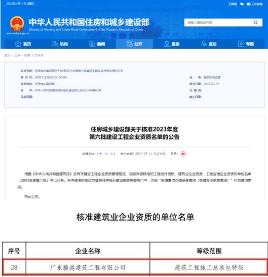 2023年7月11日,國家住房和城鄉(xiāng)建設部發(fā)布《住房城鄉(xiāng)建設部關于核準2023年度第六批建設工程企業(yè)資質名單的公告》,碧桂園科建集團旗下的廣東騰越成功升級建筑工程施工總承包特級資質,是佛山市本土首家獲取建筑施工總承包特級資質的建筑企業(yè)。此前,廣東騰越已擁有三個一級資質(建筑工程施工總承包一級、市政公用工程施工總承包一級、機電工程施工總承包一級)。